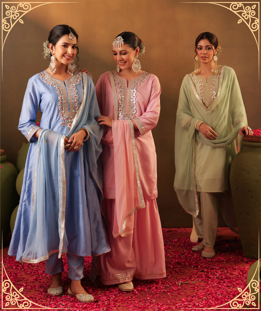 Blue Silk Embroidered Floral Notched Kurta And Palazzo set