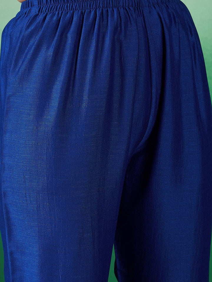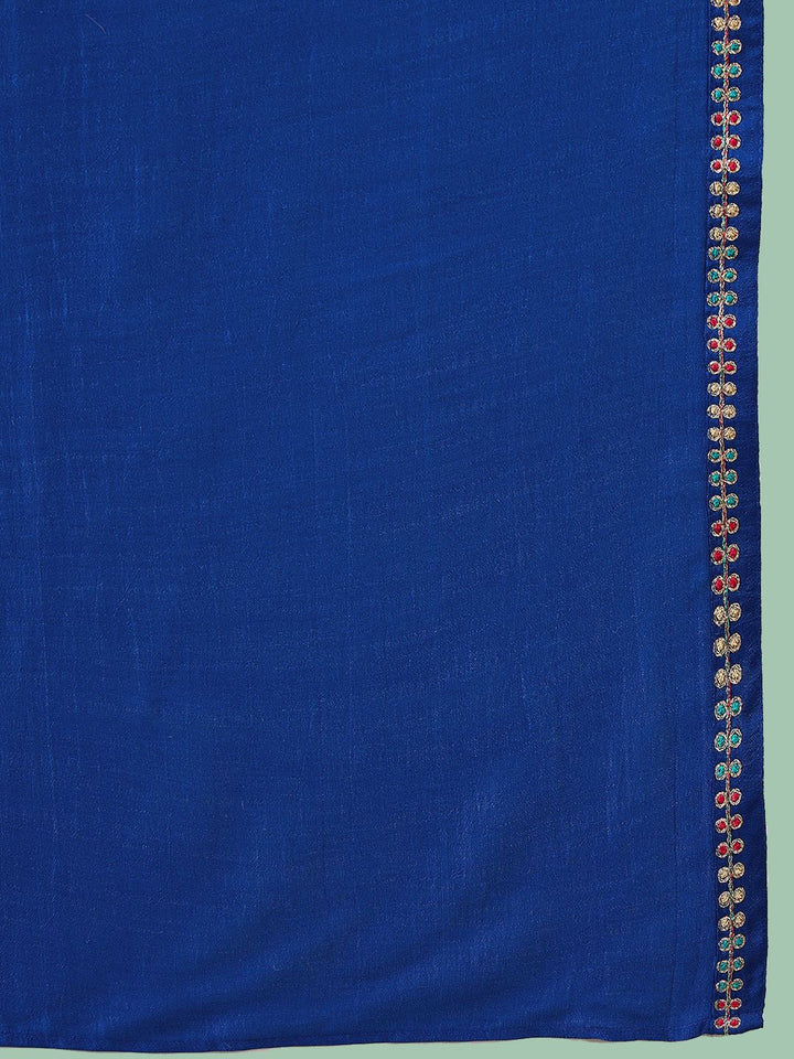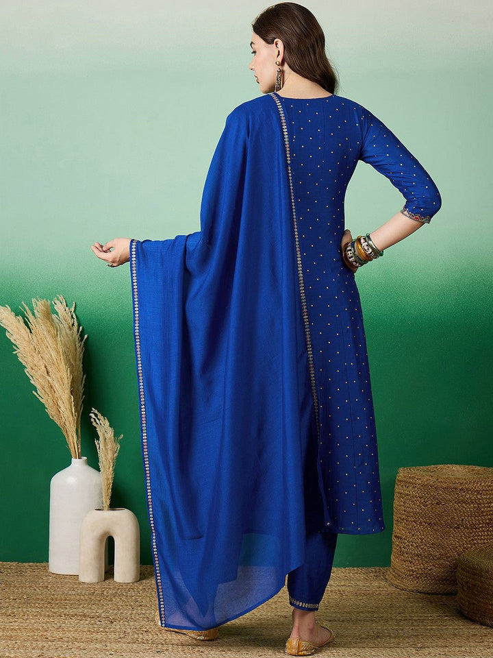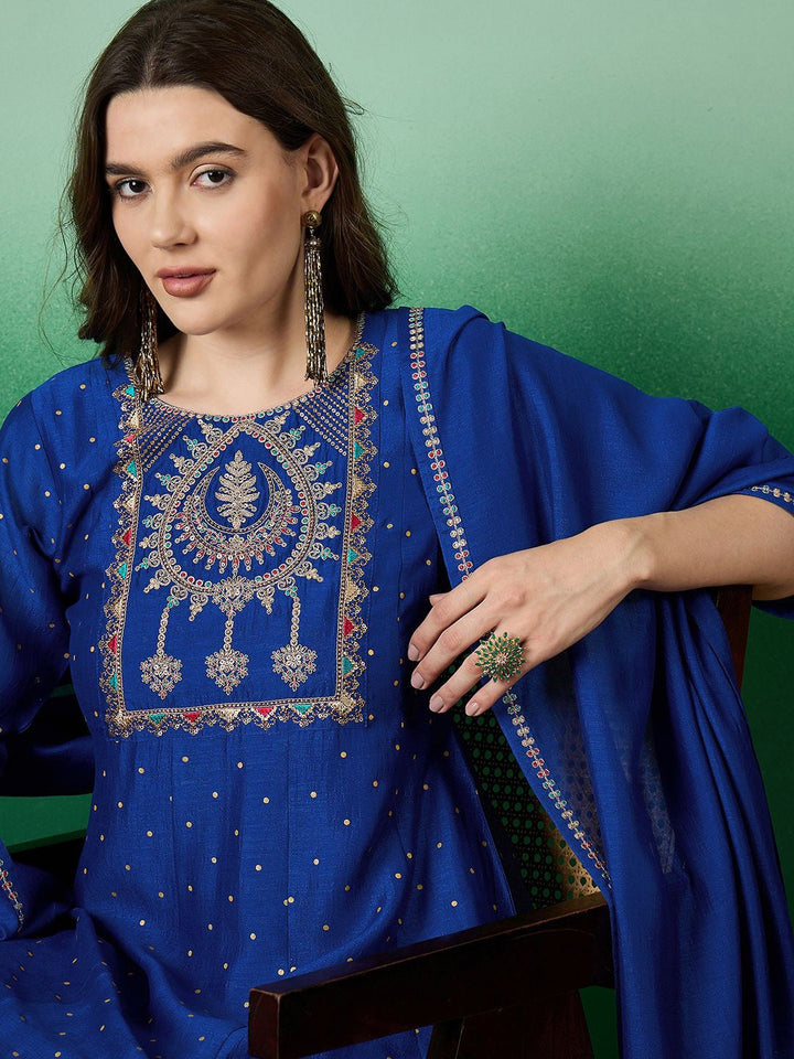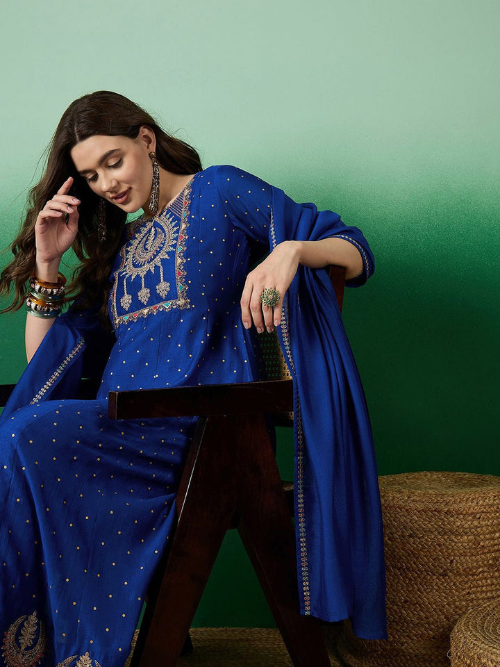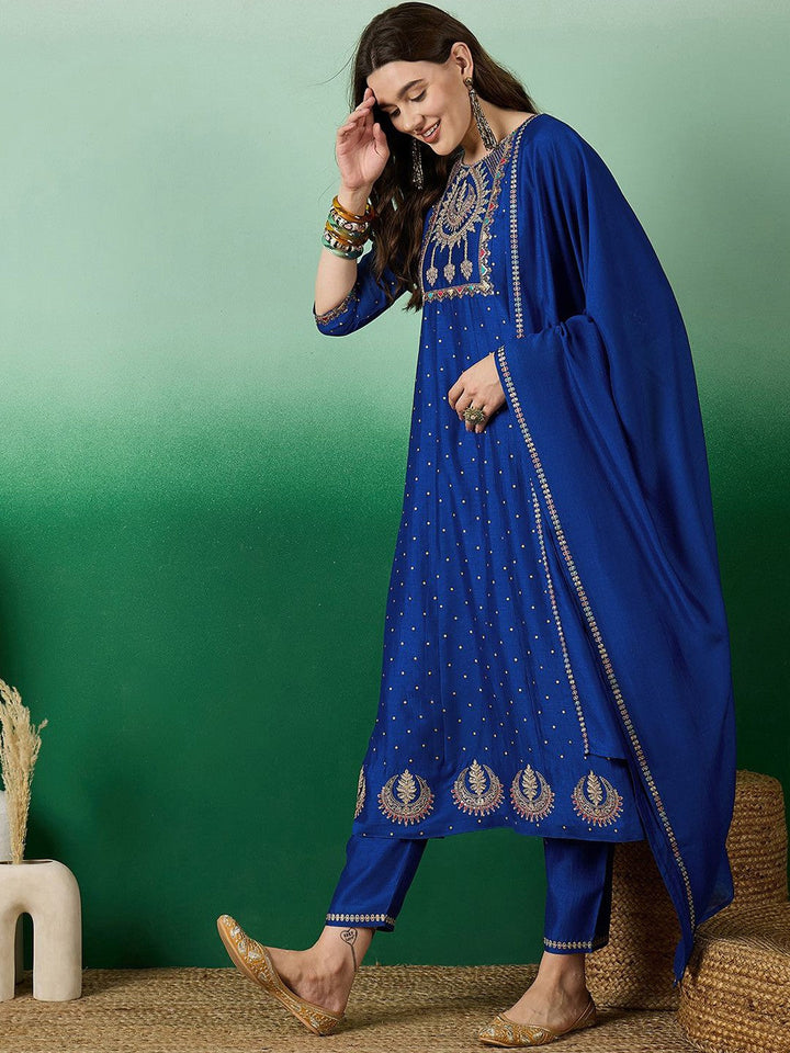 Blue floral Embroidered A-Line Kurta & Trousers With Dupatta