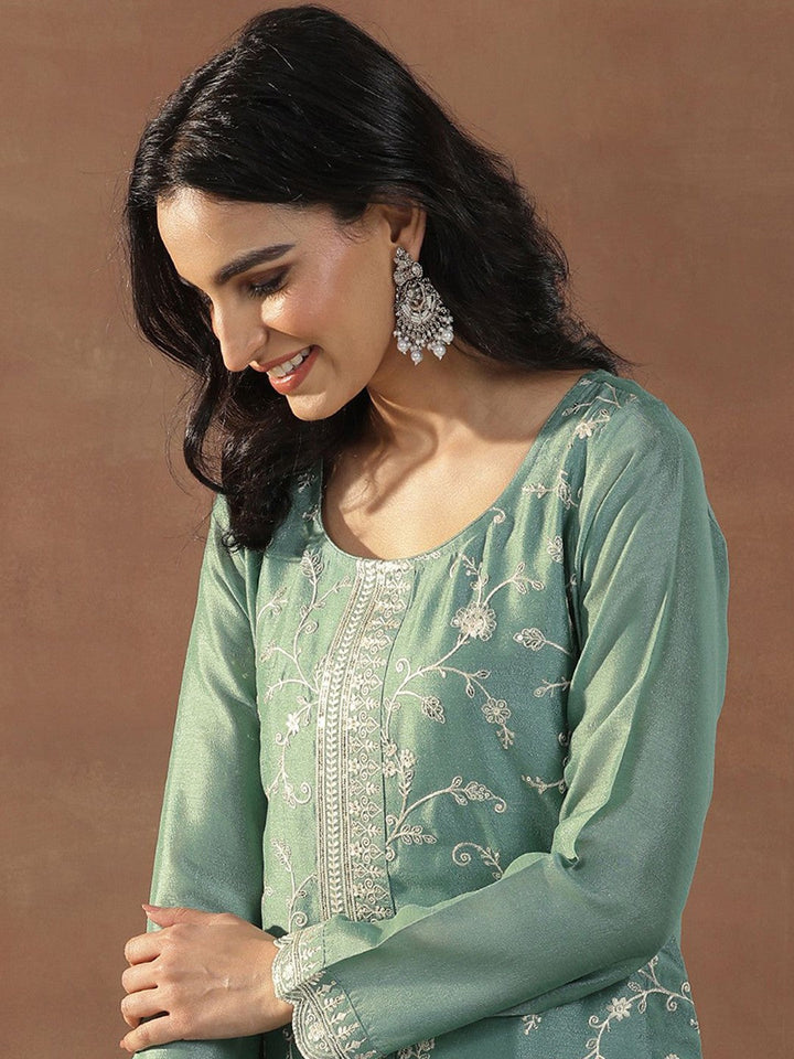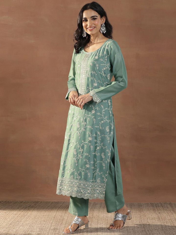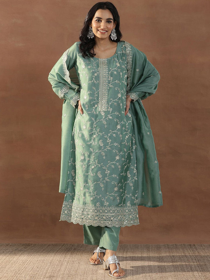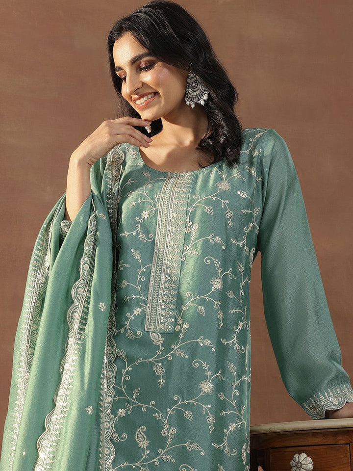 Green Floral Embroidered Sequinned Straight Kurta With Trousers & Dupatta