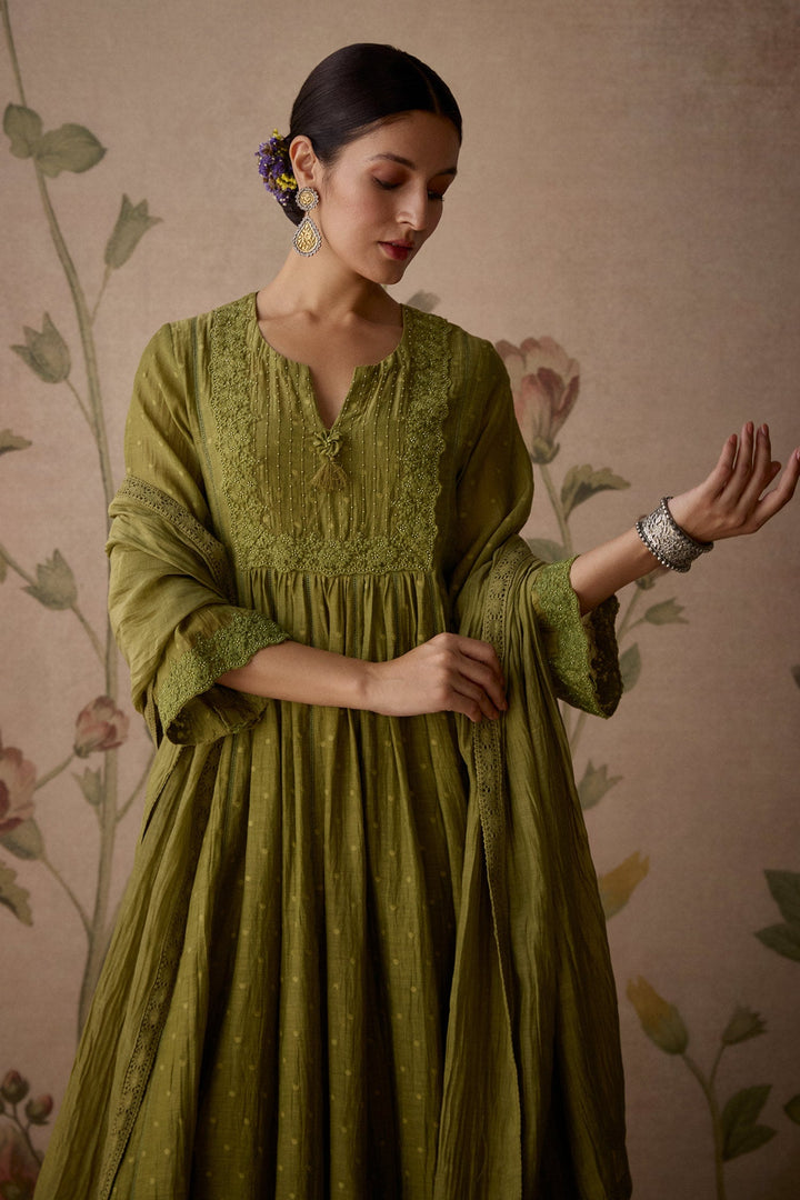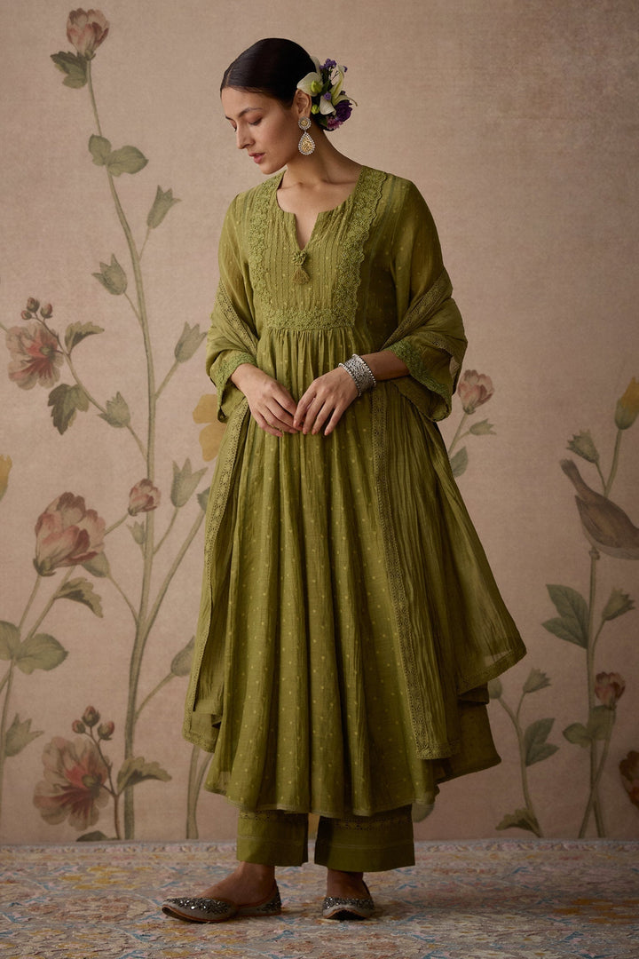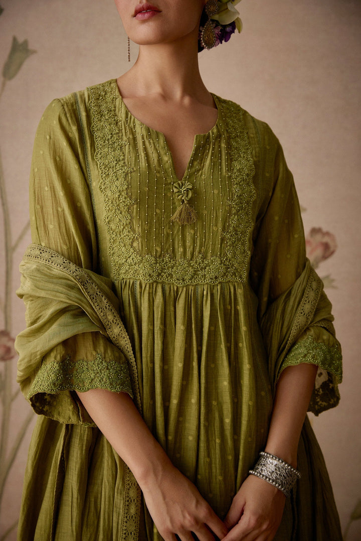 Green Kurta And Dupatta Chanderi Embroidered Bead Notched Lace A-line Set