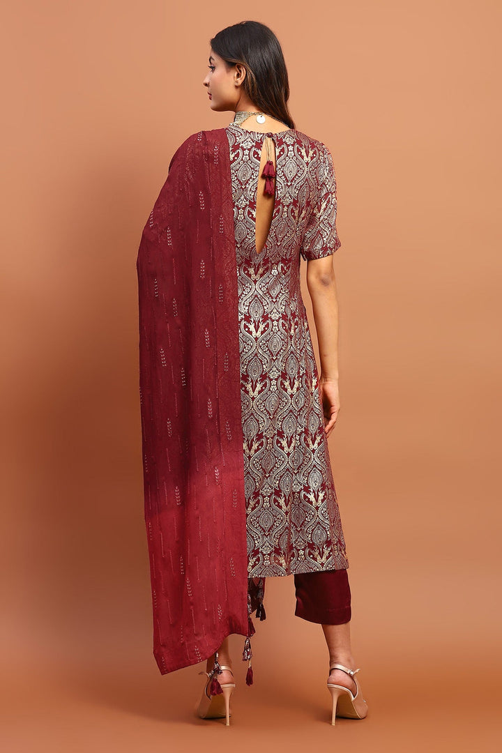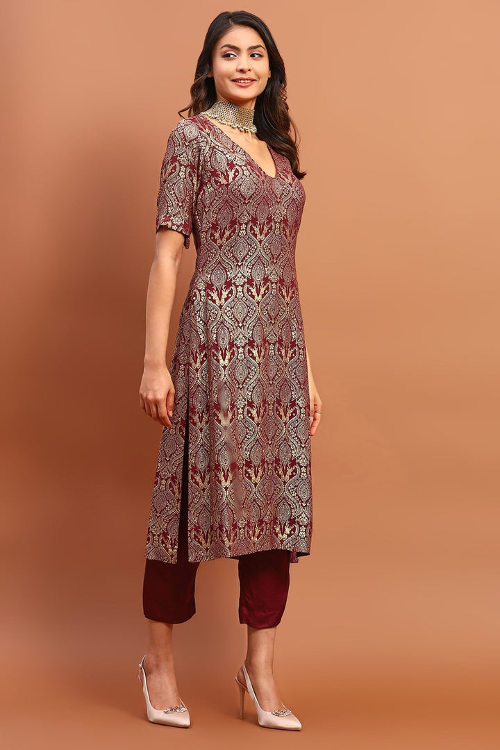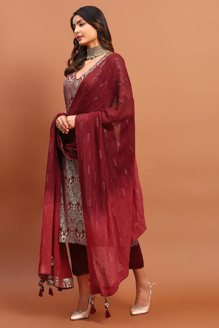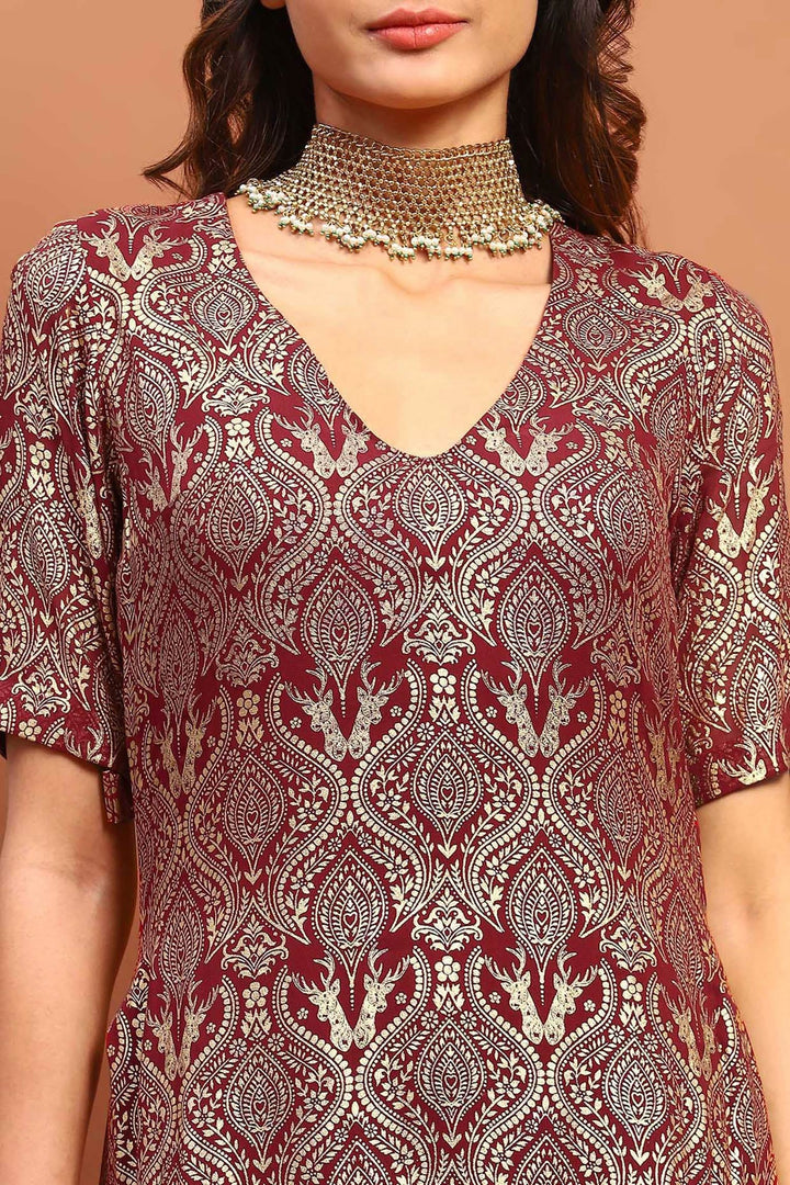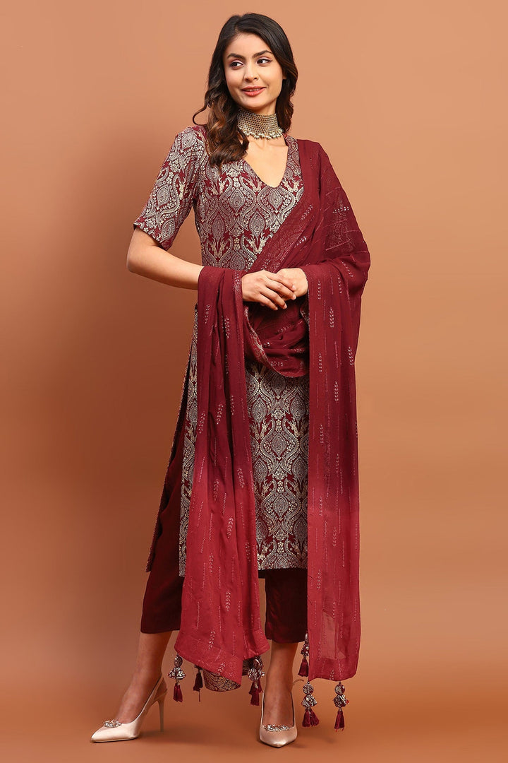 Maroon Georgette Printed And Embroidered Foil V Neck Kurta Pant Set