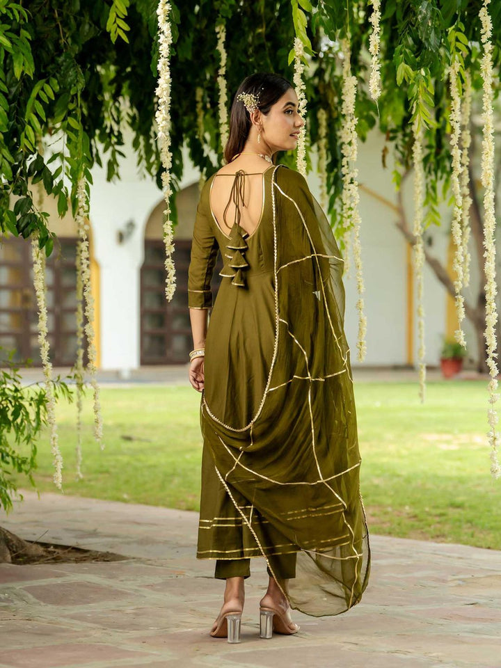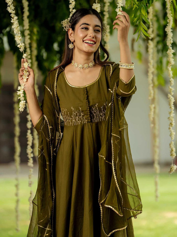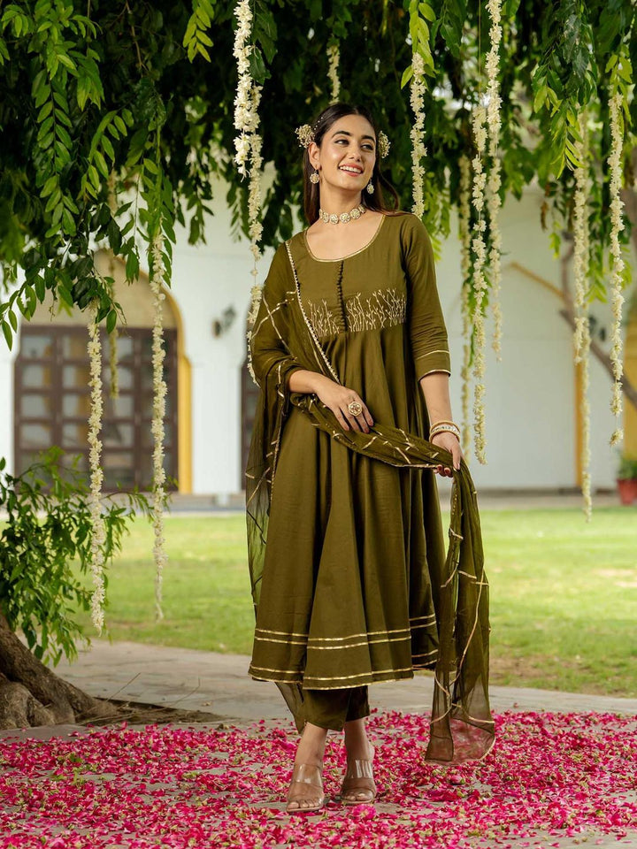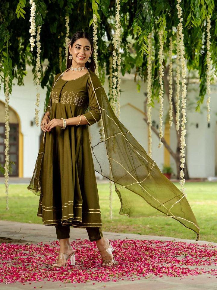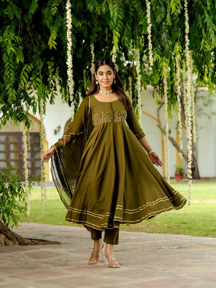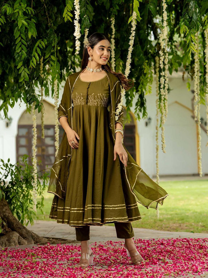 Olive Zari Embroidery Anarkali with Pant and Dupatta (Set of 3)