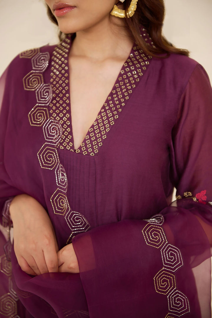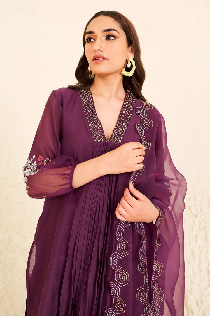 Pink Chanderi Cotton Hand Embroidered Sequin V Neck Work Pleated Kurta Pant Set