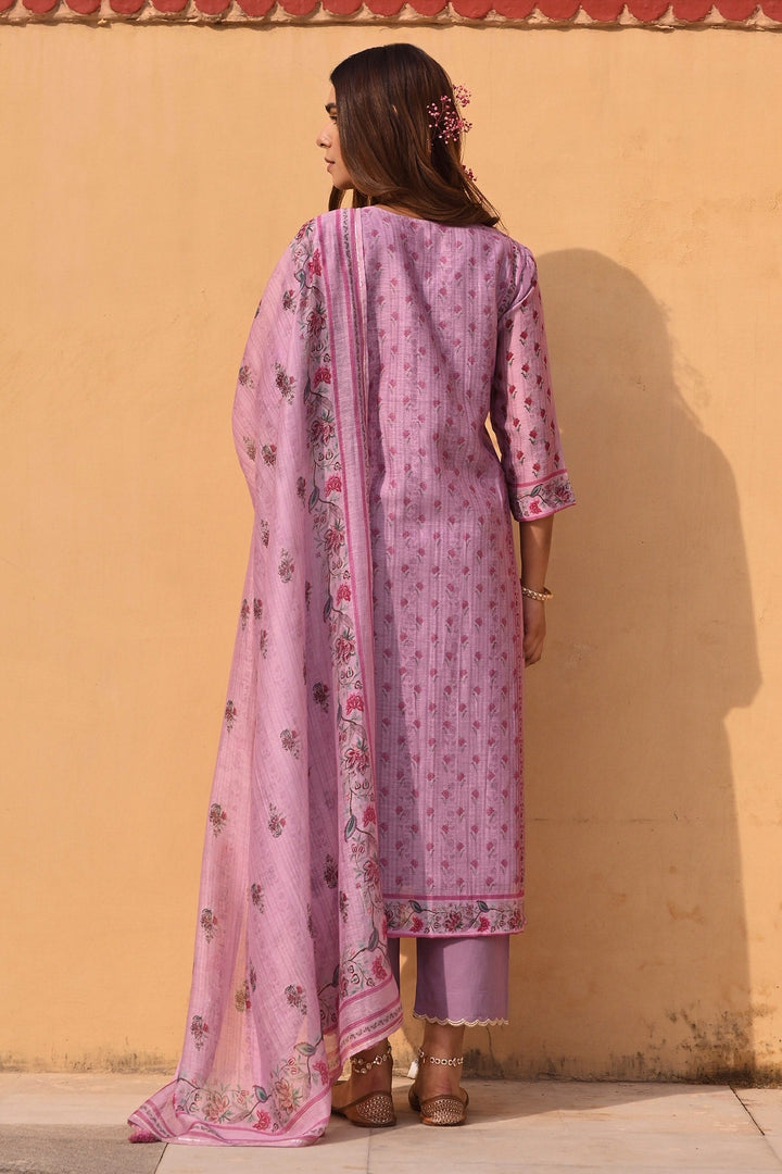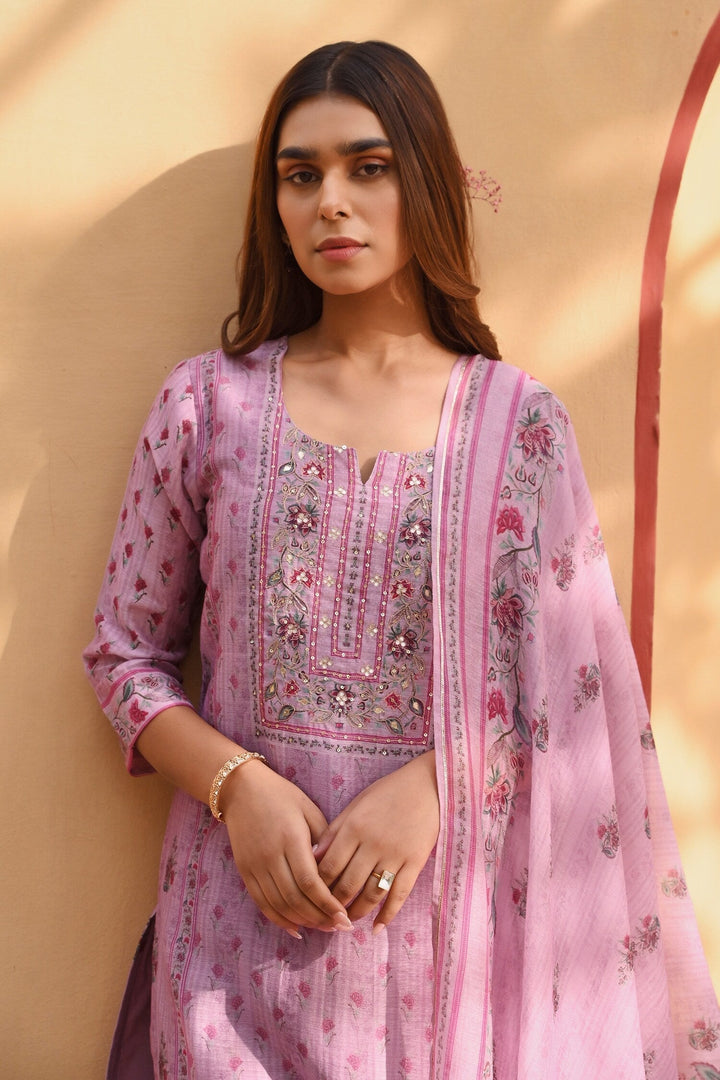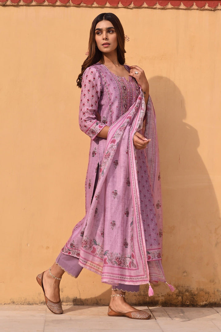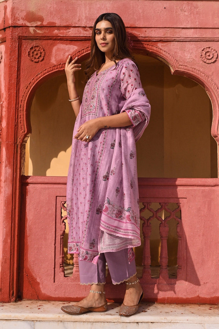 Purple Kurta And Dupatta Linen Printed Floral Stripe Notched Set