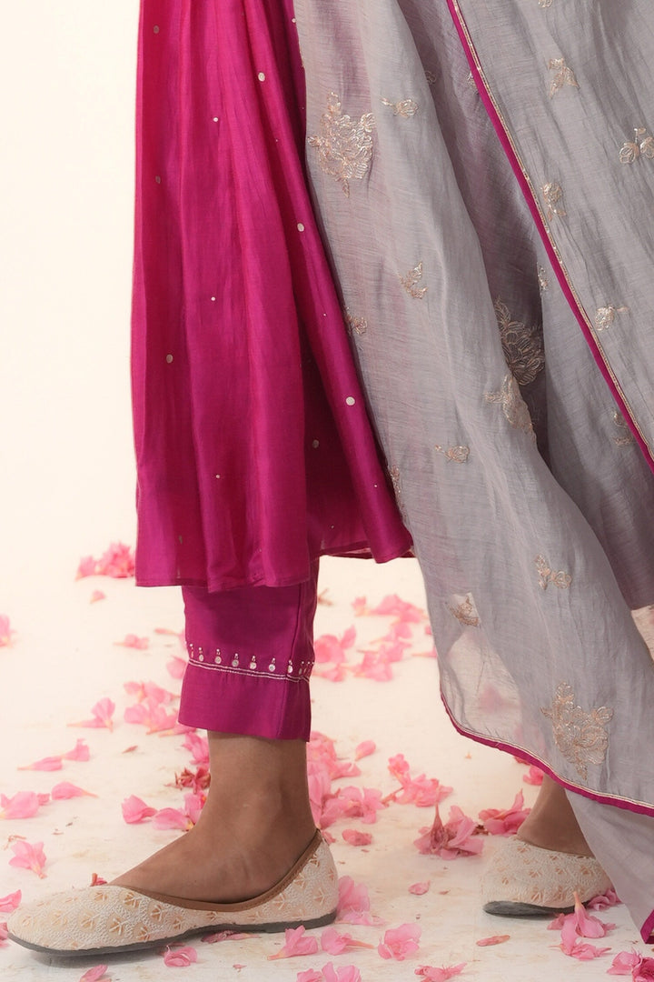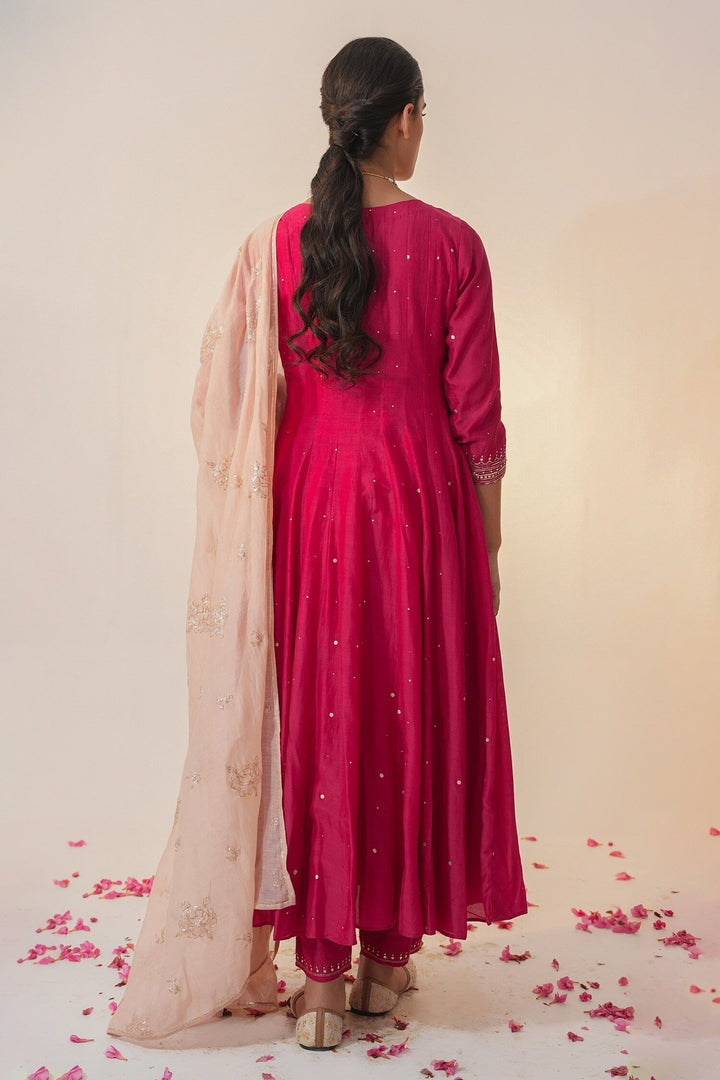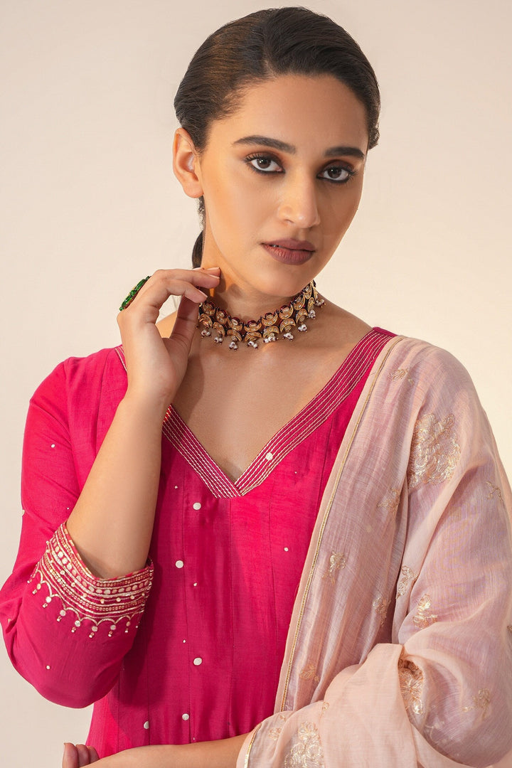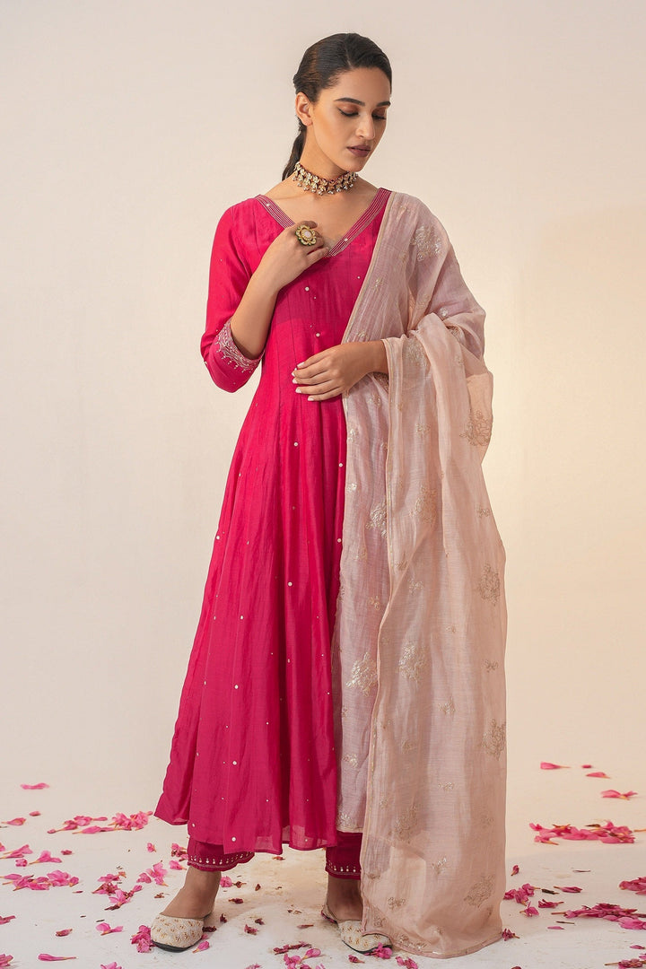 Red Cotton Silk Hand Embroidery Pittan V Neck Tashreen Anarkali Trouser Set