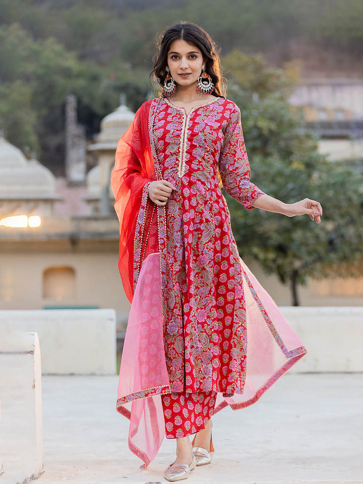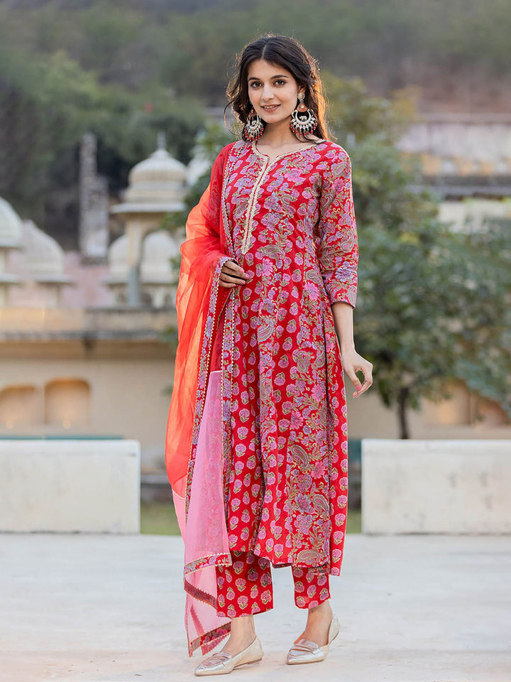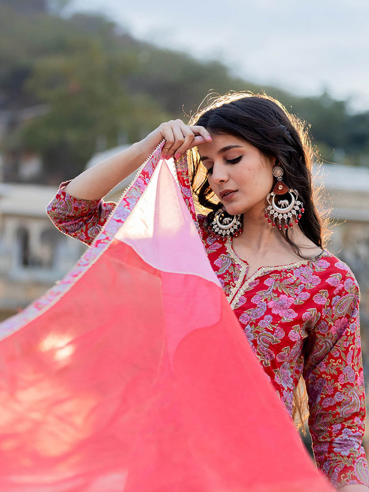 Red Floral Print Anarkali Kurta Trouser & Dupatta (Set of 3)