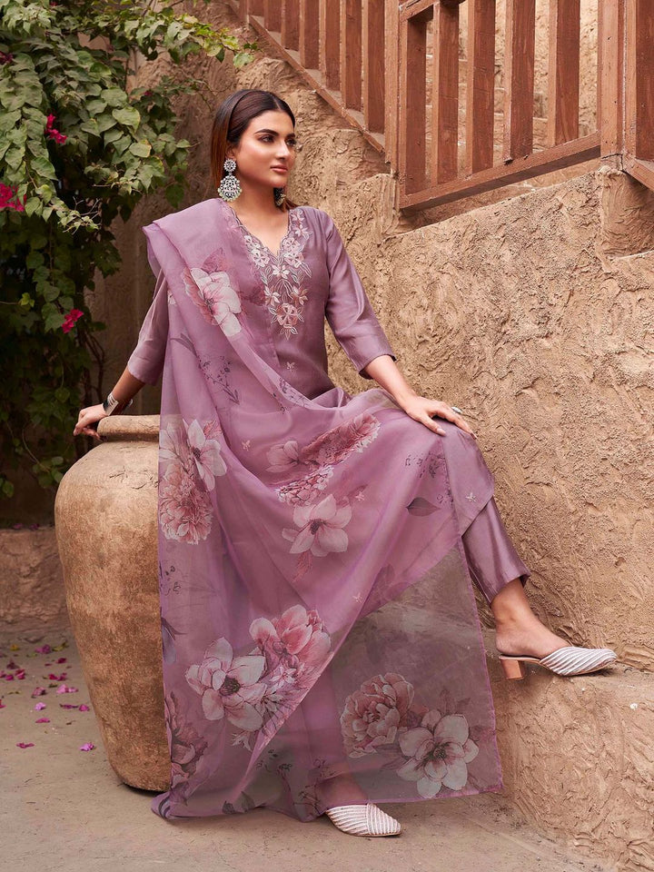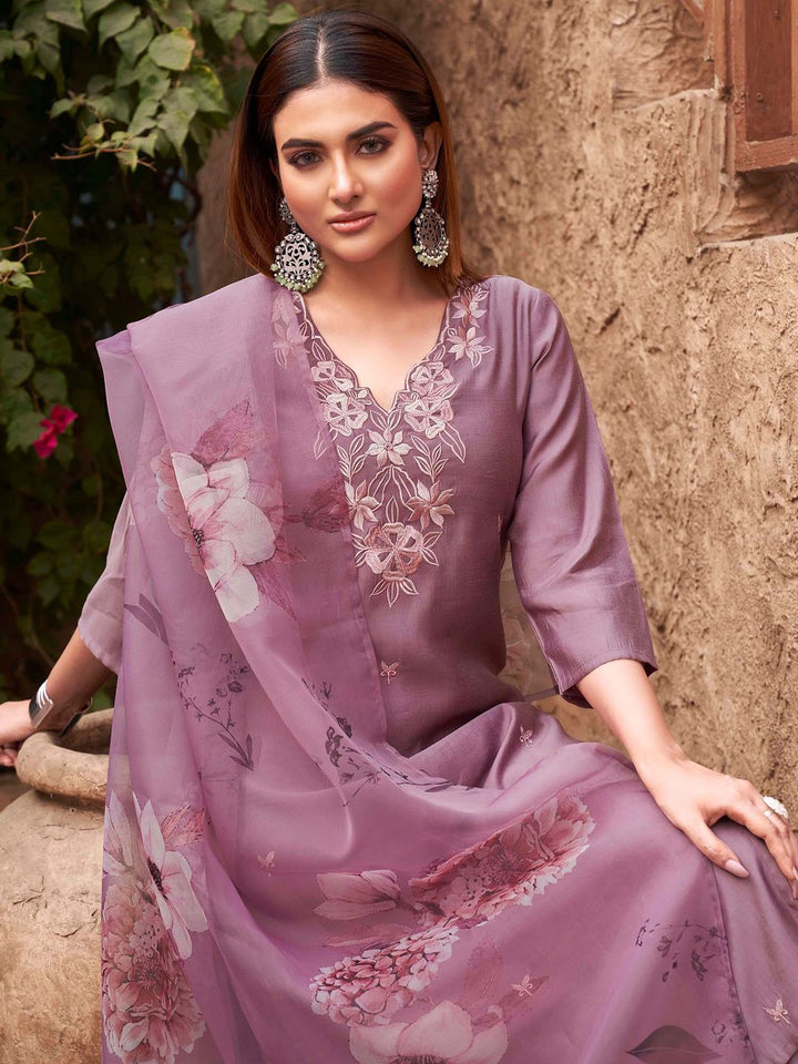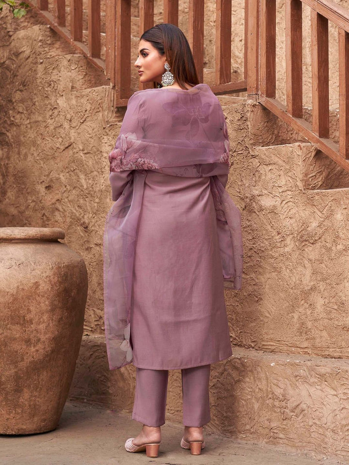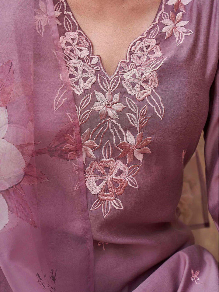 Women Mauve Silk Blend Embroidered Kurta with Pant and Dupatta (Set of 3)